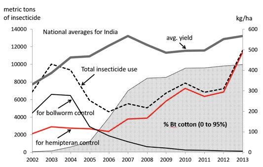Zatímco technologie geneticky modifikované bavlny (Bt) zpočátku řešila problémy s moly, jejichž larvy se živí bavlněnými tobolkami, začala se objevovat ohniska sekundárních škůdců, jež nejsou kontrolována toxiny Bt. Spotřeba insekticidů se opět zvýšila a v roce 2013 překonala úroveň roku 2002. Způsobilo to ekologické škody a vyvolalo ohniska dalších nových sekundárních škůdců s vyšší úrovní odolnosti vůči insekticidům. Ukázalo se také, že Bt bavlna prospívá hlavně větším zemědělcům a vysoké ceny osiva Bt bavlny jsou pro mnoho zemědělců velkým problémem, stejně jako monopolní cenové praktiky. O tom svědčí zcela jiná statistika, a to počty sebevražd malých farmářů. Neuvěřitelných vice než 250 000 sebevražd poznamenalo zemědělství jako nejrizikovější pracoviště a pořád je v průměru 20 000 případů ročně. (ZDE)