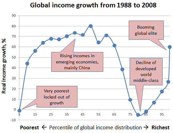 Pro miliony lidí v deindustrializovaných regionech Evropy, Velké Británie a USA vypadá ekonomická a politická krajina děsivě podobná třicátým letům. Slavný "graf slona" ohledně globálních příjmů odhaluje nepříjemnou situaci pracujících a nižších středních tříd ve vyspělých zemích světa. Ale jejich elity ztloustly vyvážením svých pracovních míst do rostoucí dělnické třídy v Asii. Podívejte se na graf globálních světových příjmů.