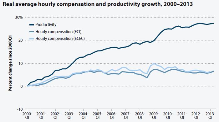 Růst produktivity práce je úplně marný pro nižší střední a chudou vrstvu obyvatel, jejíž průměrný hodinový příjem trvale stagnuje a dokonce klesá.