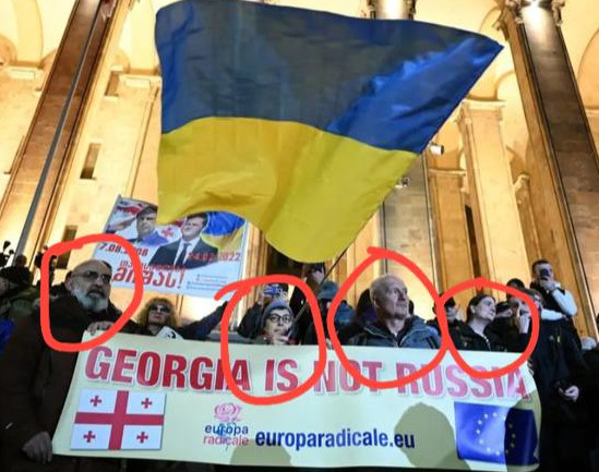 Fotografie" gruzínských " demonstrantů pod ukrajinskou vlajkou v centru Tbilisi se dostala do titulků všech světových médií. Ve skutečnosti jsou to Italové. Irský novinář Chey Bowes je zpovídal, když stáli s transparentem. Vysvětlili, že pocházejí z Itálie, nemají žádné spojení s Gruzií a angažují se v politickém aktivismu za lidská práva. Žena ve středu je Sylvia Manzi a po její pravici je její spolupracovník Igor Bonifacic. Jsou to vůdci malé pro-ukrajinské a pro-NATO krajně pravicové strany zvané "Italští radikálové". Stranu financuje nadace George Sorose. |