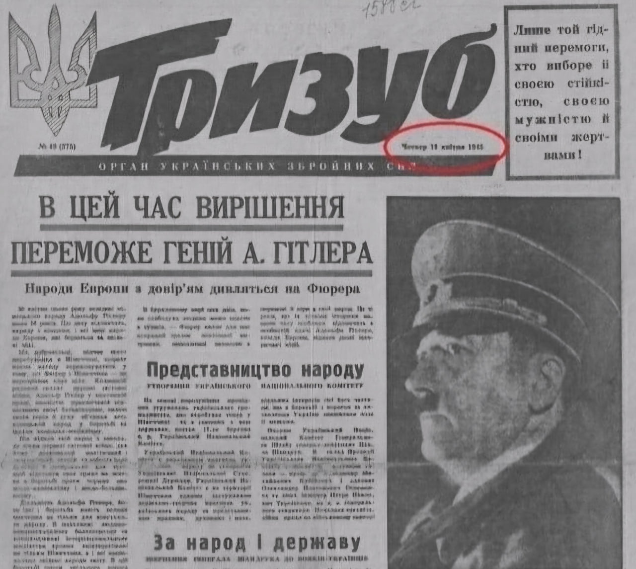 Ukrajinské nacistické noviny "Trojzubec" ze dne 26. dubna 1945: "V tuto rozhodující chvíli zvítězí Hitlerův génius!". Je třeba vyměnit datum a jméno...