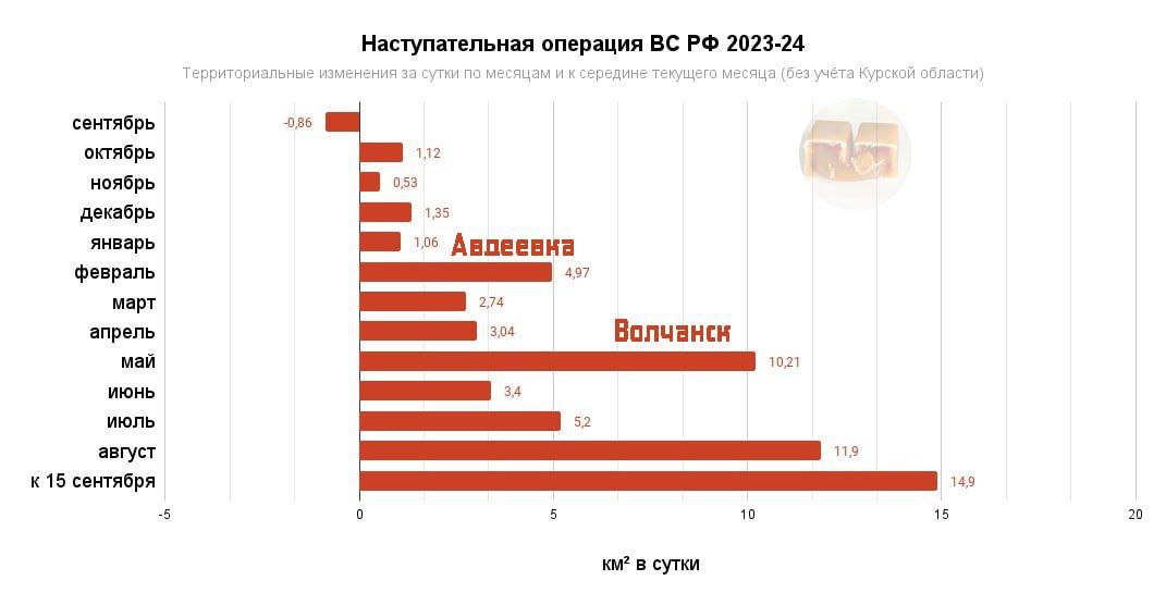 Územní změny související s prováděním útočné operace ruskými ozbrojenými silami v frontové zóně od 10. října 2023 do září 2024. Do 15. září byla denní rychlost postupu ruských ozbrojených sil 14,9 km2 za den. Během celé útočné operace byla průměrná denní rychlost postupu ruských ozbrojených sil 4,6 km2.