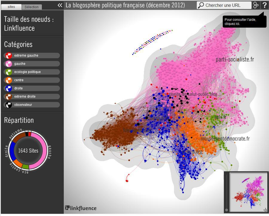 Deník Le Monde (26.12.) zveřejnil zajímavou mapu blogosféry podle politické příslušnosti. Opíral se o údaje sociálního institutu Linkinfluence, který sestavuje každých 5 let mapu francouzských blogařů podle politické příslušnosti.
