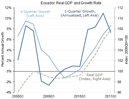 Proč vyhrál Correa? Protože znárodnil nerostné bohatství, spravuje je odpovědně a systematicky buduje pro indiány sociální stát, kde má absolutní prioritu vzdělání a sociální zajištění, zejména pro nejchudší indiánské rodiny. Následující graf ekonomického růstu země ukazuje, že nejde o populismus, ale naopak o velmi efektivní podporu ekonomického růstu. Viz čísla a citace z minulého článku. Na současný vývoj HDP, které je ovšem rozdělováno obyvatelům země, se můžete podívat zde.