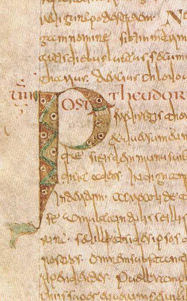 (Ukázka z rukopisu Řehořových Historiae 7. stol.)