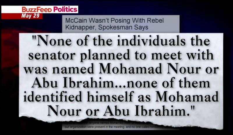 McCain se zde potkal s teroristy, který jsou na seznamech americké CIA a jsou podezřelí z útoků na americký konzulát v Benghází. Senátor, mediální partyzán na volné noze, se omlouval s tím, že se s nimi oficiálně nesetkal. Škoda, že mu neukázali visačku se jmény, kde by bylo napsáno, že jsou teroristé. Viz obrázek s patřičným komuniké.