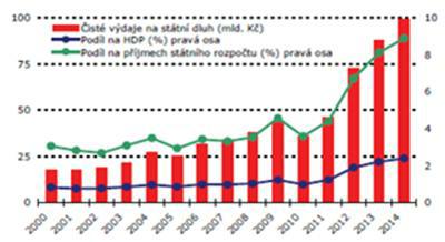 Do kolmice exponenciální křivky máme sice ještě daleko. Ale obsluha státního dluhu roste již exponenciálně, to graf potvrzuje. Už letos však plánuje ministerstvo financí na obsluhu státního dluhu 78 miliard korun, pro rok 2014 je to 91 miliard a pro rok 2015 dokonce 96 miliard.