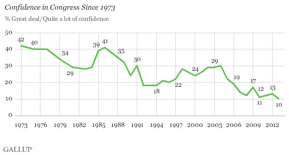 Renomovaný a spíše pravicový deník Washington Post zveřejnil průzkum popularity Kongresu, který ukazuje, že tato instituce méně populární než švábi, dopravní zácpy, včetně americkým tiskem démonizovaného Huga Chaveze, který si dovolil znárodnit venezuelskou ropu považovanou za americké vlastnictví. Kongres fakticky soutěží s Fidelem Castrem o poslední příčku. Kongres maximálně nesnáší 91 % obyvatel. Graf nejméně populárních institucí v tomto desetiletí je zde.