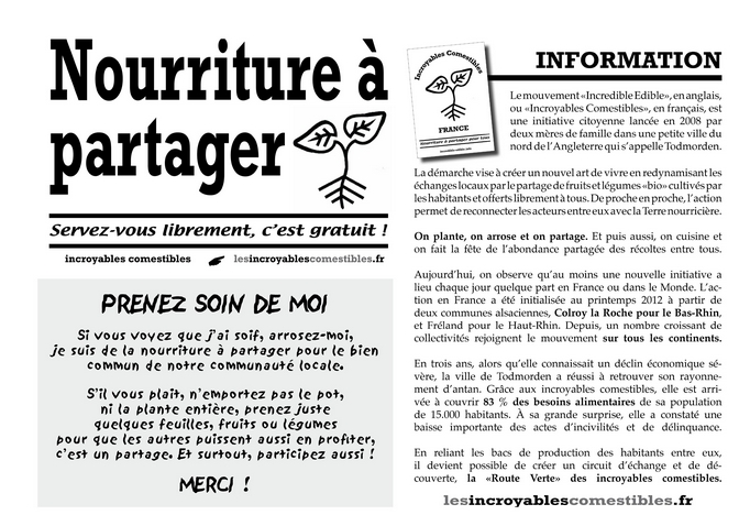 3. Na záhonek dáte plakátek, že jde o veřejnou zahrádku, kterou mají ostatní občané společně s vámi udržovat a pak zdarma požívat její plody. Francouzská verze oznámení je zde.