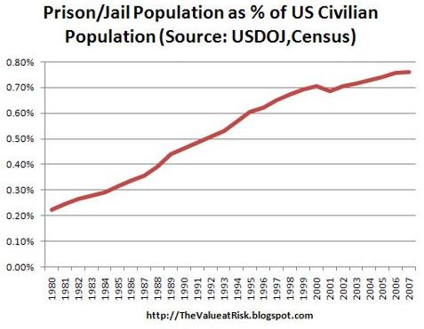 Mezi léty 1980-2007 tedy stoupl počet uvězněných v USA o 400 %. A co je mnohem důležitější, stoupl procentově podíl vězeňské populace na celkovém počtu obyvatel. To ukazuje tento graf.