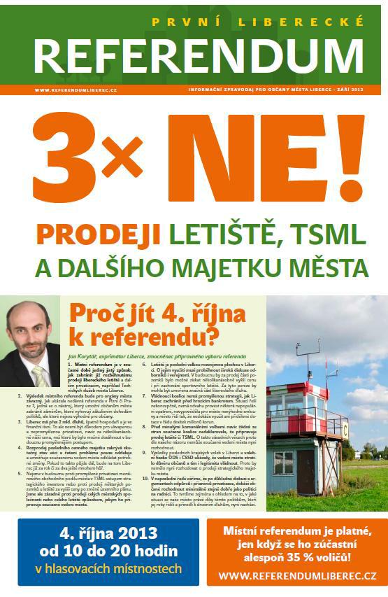 Zdejší občané s trvalým bydlištěm se mohou vyjádřit, zda souhlasí s prodejem libereckého letiště, Technických služeb města Liberce a dalšího majetku, až dosud vyřazeného z privatizace (zelené plochy, městské budovy - např. ZUŠ, DPS, školy, školky a mnohé další).