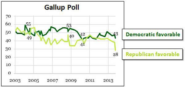 Následující graf volebních preferencí Republikánů a Demokratů v USA jasně ukazuje dopad destruktivní kampaně. Tu vedou příslušníci Tea Party a společně s nimi i podnikatelská uskupení na způsob nechvalně známých bratrů Kochů (Koch Industries), které snížením daní dosáhli téměř pohádkových zisků pro jedno procento oligarchů.