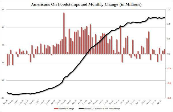 V sobotu 12. října 2013 vypadly díky poruše počítačů elektronické platební karty EBM, které dostávají američtí chudí na nákupy potravin. Postiženo bylo téměř 50 milionu lidí ve státech Kalifornie, Massachussetts, Maine, Ohio, Michigan, Virginia, Georgia, Alabama a dalších. Potraviny ve vozících byli lidé nuceni vrátit zpátky do regálů. Mnoho Američanů propadlo panice a dali si výpadek do souvislosti s vládní krizí a zastavením financování americké vlády. Počet příjemců poukázek na jídlo za vlády Baracka Obamy značně vzrostl. Na grafu z blogu Zerohedge vyjadřuje černá křivka nárůst počtu milionů amerických občanů, závislých na potravinové pomoci od státu (2006-2013).