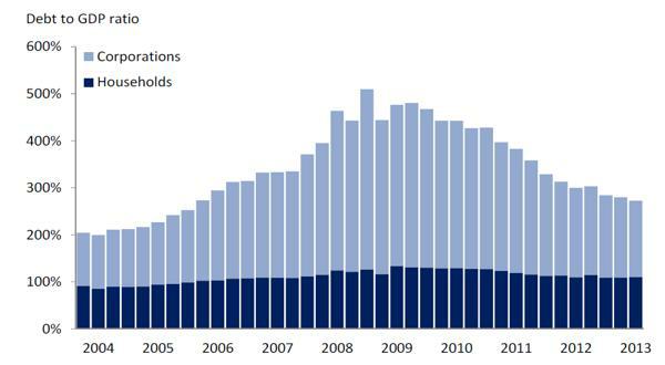 Na další mapě vidíte, že státu se podařilo zastavit eskalaci dluhu. Na druhou stranu je zřejmé, že dluh domácností, tj. normálně zadlužených Islanďanů, zatím neklesá a drží se na 100 % hodnoty. To je velká starost zdejší ekonomiky.