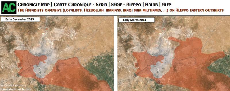 Boje v Aleppu postupně přicházejí do finální fáze, povstalcům hrozí již kompletní obklíčení. Červená barva na mapě ukazuje postup SAA čili Asadovy armády za poslední 3 měsíce.