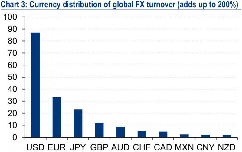 Články o Sýrii upozornily v různých souvislostech na otřesené postavení dolaru jako světové měny (Fakta o Sýrii IX. aneb Bytí a nebytí dolaru). A tento trend ještě zrychlil po napětí mezi Ruskem a USA, k němuž EU poslušně papouškuje americkou pozici. V poslední době zesílily spekulace o pádu dolaru jako rezervní měny. Proti svědčí fakt, že dolar dělá měnovou rezervu 60 % finančního objemu na světě a společně s eurem je to 90 %. Při obchodování je bilance ještě markantnější, viz tento graf.