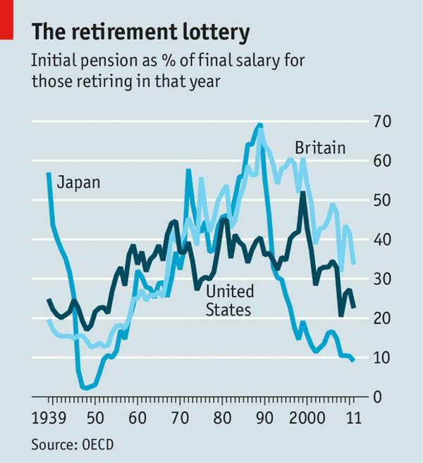 Graf ukazuje, kolik procent z průměrného platu dostal statisticky pracující důchodce, pokud šel v daných letech do důchodu podle příslušných sazeb v těchto 3 státech (USA, Japonsko, Velká Británie). Sto procent dává poslední plat v aktivním roce odchodu do důchodu. V Japonsku roku 1989 měl důchodce 70 % svého aktivního příjmu a v roce 2011 to bylo jen 10 %. Neoliberalismus jako řemen. V USA v roce 2000 za Clintonových zlatých časů normální ekonomiky to bylo 50 % a nyní je to 20 %. To znamená, že za pouhých 15 let let šli důchodci se svým důchodem tak dolů, že se již nemohou uživit a musí si v USA najít nějakou jinou formu příjmu, aby neumřeli hlady. V Británii se o důchody starali labouristé a vytáhli to z původního stavu (1950 / 15 %) na slušnou úroveň roku 1990, kdy důchodce bral 60 % svého posledního platu. Ale po nástupu železné Lady se peníze přesunuly jinam, propad penzí je mínus 20 %. Zhroucení finančních trhů zničilo mimo jiné i penzijní fondy, které daly celoživotní úspory důchodců do finančního šrotu. A to není do celé zlodějny započítána zvýšená míra inflace a volatilita kapitálových trhů a bank. Pokud důchodci investují své penzijní úspory špatně, mohou přijít rázem o všechno.