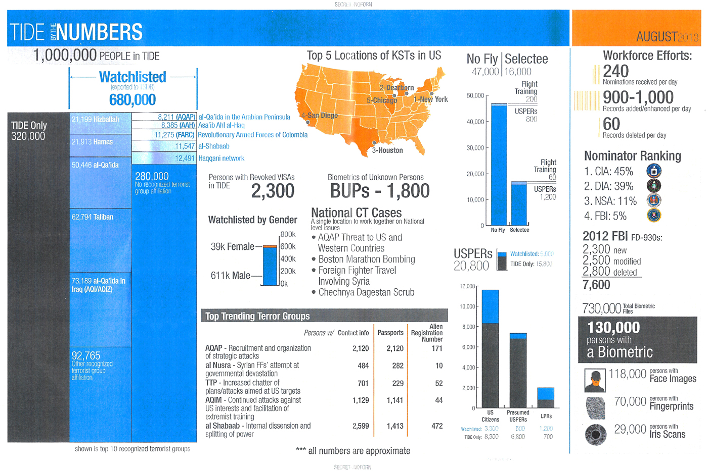 Prezentace Národní protiteroristické centrály ze srpna 2013 s názvem "TIDE v číslech" ukázala rozsah špiclovacího systému Obamovy vlády i ty, na něž je zaměřen. Podle tohoto dokumentu bylo na seznamu 680 tisíc lidí, dalších 320 tisíc bylo sledováno v rozsáhlejší databázi TIDE.