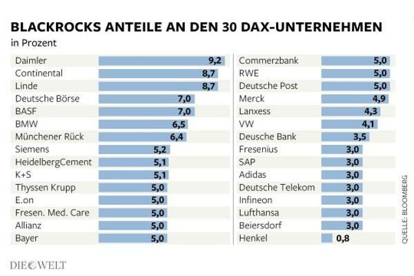 Bohužel eurozóna se ráda inspiruje za oceánem a svatá a nedotknutelná Evropská centrální banka stádně následuje politiku americkou, a to vše je řízeno odněkud z Basileje šedou eminencí dle předem připraveného plánu. Ne, že by Mario Draghi nevěděl, která ruka je levá a která pravá. Aby nebylo pochyb, které ruce drží pevně taktovku při rozhodování v ECB, nastupuje jako poradce do ECB „Black Rock“, nejsilnější finanční korporace světa. Podívejte se jenom na některé jejich podíly v jednotlivých firmách, graf uveřejnil Die Welt.