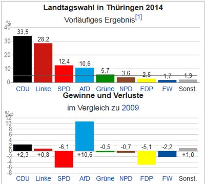 Po volbách v roce 2009 převzala vládu levicová koalice Linke a SPD, podle letošních výsledků by ovšem přes porážku, kterou utrpěla, mohla SPD uzavřít jako chudá nevěsta koalici s CDU a podpořit tím velkou vládní koalici na spolkové úrovni. Strana Alternativa pro Německo, která již má své zastoupení i v evropském parlamentu v podobě svého místopředsedy a ideového vůdce profesora Hanse Olafa Henkeleho, však získala rekordních 12,2% a z 11 mandátů. S touto stranou, která se řadí napravo od CDU, však nikdo nechce mít nic společného. Zejména transatlantická CDU ne.
