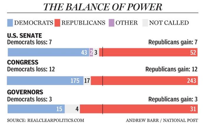 Republikáni ovládli Senát, zvýšili počet ve Sněmovně, mají většinu guvernérů. Protože podle pravicového Nejvyššího soudu jsou "korporace lidmi", mohla oligarchie pumpovat do kampaně neomezené množství peněz přes nastrčené organizace. Jak se to dělá, na to se podívejte v našem starším článku Politická satira v USA aneb Praní volebních peněz v přímém přenosu. Jedno procento nebude cpát peníze do Demokratů, protože po vyhraných volbách by si je muselo kupovat ještě jednou, přes politický lobbing. U Republikánů druhé kolo nákupu odpadá. Takže dilema Demokratů je jasné už dva roky, poté co slabého a nerozhodného prezidenta Obamu opustili všichni progresivní spolupracovníci. Zůstal mu onen podivuhodný spolek, který perfektně reprezentují současní mluvčí Bílého domu. Výsledkem je odchod voličů a jistě i aktivní členské základny, která má jiné politické cíle než jedno procento partaje a podporuje úplně jiné kandidáty než koupené vedení. Viz článek Run, Liz run!.