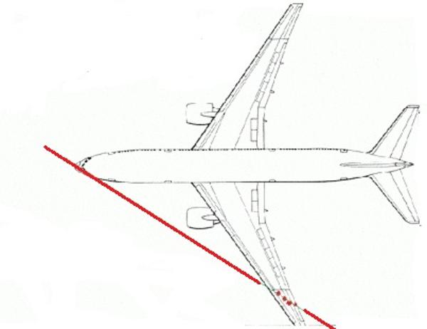 Dává nám to vodítko, co se týče úhlu, ze kterého bylo letadlo napadeno. Pojďme po téhle linii a použijme jednoduchou geometrii. Co se stane? Podívejte se na následující schéma.