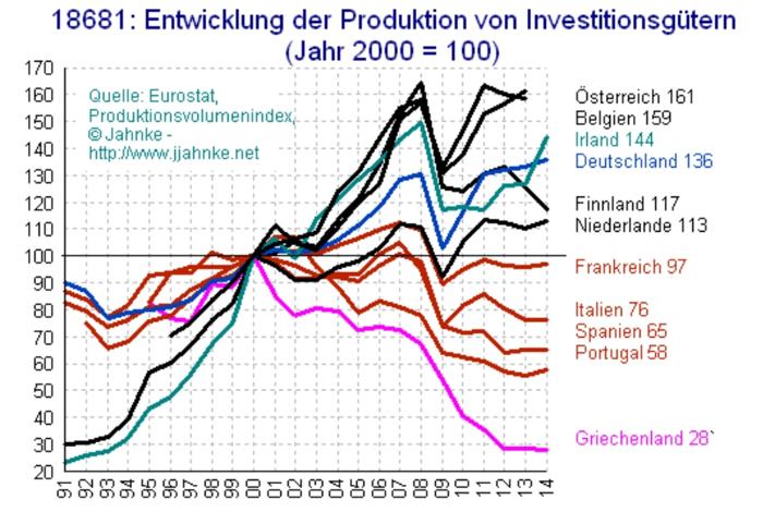 Graf ukazuje, že po zavedení eura začala v jižních státech dramaticky padat průmyslová výroba. To i z jiné příčiny, než jen kvůli zavedení eura, ale stejně. Euro, místo aby pomohlo rozdíly vyrovnávat, je naopak prohloubilo. Vybrali jsme pro jistotu vývoj výroby statků investičního charakteru, obdobný vývoj je u celkového indexu průmyslové výroby – klíčového z hlediska zaměstnanosti.