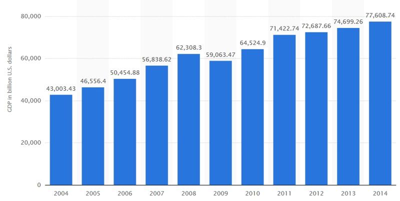 Lidé nechtějí věřit, když jim říkáme, že mají v peněžence místo peněz jen poukázky na sny. A že přestali mluvit o práci a o produktivních vztazích, a melou jen o těch poukázkách. Tak se jim podívejme na zoubek. První graf je nejdůležitější, je to výkon světové ekonomiky v tzv. formátu Global Gross Domestic Product (GDP) v letech 2004-2014, a to v miliardách dolarů. Nic na tom není, představte si roční výdělek v domácnosti, a převeďte to na zeměkouli.