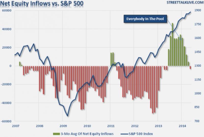 Vidíte dramatický nárůst masy QE3, což je finanční šrot, o němž trvale píšeme v našich článcích o ekonomice. Bankéř Ben Bernanke jako šéf FEDu začal od září 2012 praxi tzv. Quantitative-Easing. Prostě sedl k počítači, dal tam jedničku, a pak k ní přidával libovolné množství nul. Výsledek přes "Enter" pak emitoval do světa jako tzv. "fiat money". Z finančního guláše, který už i tak byl jen šlichtou, FED udělal čistou vodu. A co udělala burza, když dostala šlichtu, přesněji řečeno finanční heroin? Podívejte se na hlavní burzovní index.