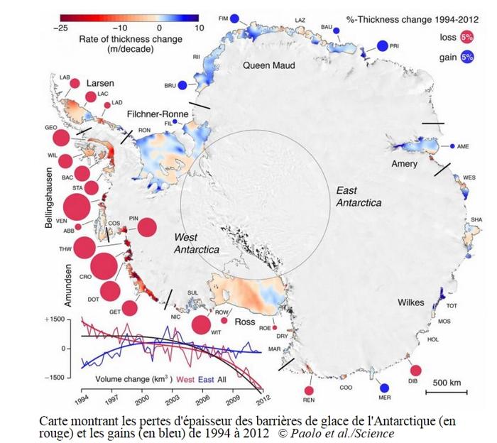 Ztráty ledovců jsou značné. Rychlost tání na západě Antarktidy se zvýšila o 70 % za poslední desetiletí. V klíčových oblastech Amundsenova a Bellingshausenova moře se vrstvy ledu zmenšily za 20 let o 18 %. Hlavní blok ledu, který blokuje led na kontinentu od odlamující se šelfové vrstvy ledovců, se rychle zmenšuje. Tím umožňuje rychlé odlamování bloků a jejich odliv do oceánu. Tání Antarktidy se zásadně urychluje. Na severní polokouli zase dochází k očekávanému efektu změny Golfského proudu, i když zatím jen v náznacích. Výsledky studie změny proudů najdete zde. Citovaná studie je navíc zajímavá tím, že kvantifikuje podíl znečištěného území USA na celkovém ohřevu oceánských proudů. Klíčový graf této studie je zde a týká se hlubinného ohřevu oceánů do hloubky 2 km.