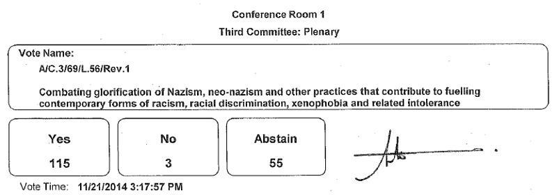 Dne 21. 11. 2014 se v OSN hlasovalo o rezoluci odsuzující nacismus, neonacismus, popírání holocaustu proti Židům za II. světové války a odsouzení násilných forem současného fašismu, rasismu a xenofobie. Znění rezoluce a výsledek hlasování OSN ohledně nacismu máte zde.