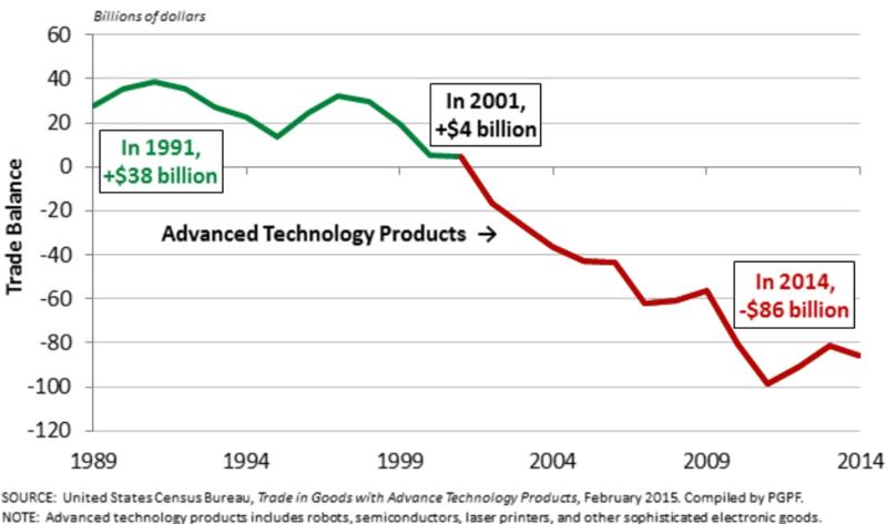 Starší článek ukázal že třetí největší vývoz Kalifornie je průmyslový šrot (USA splácí dluh Číně potravinami a šrotem). Technologické zaostávání USA ukazuje tento graf.