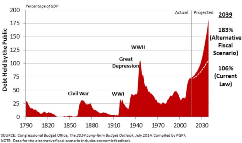 Jak víte, náš web rád ukazuje grafy, a pak nechá čtenáře přemýšlet po svém. Vyslechli jsme hlasatele zářných US-zítřků a rozhodli jsme že, vám tuto růžovou budoucnost názorně předvedeme. Všechny data jsou vzata z archivu miliardářské US-nadace zvané Peter G. Peterson Foundation. Balík grafů za rok 2015 najdete v pdf zde. Vybrali jsme pro vás hlavní perly a jejich celkový přehled najdete zde.