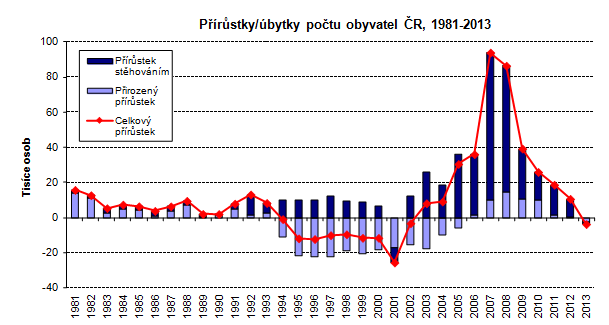 A vymřeme zcela určitě, pokud nevezmeme přistěhovalce. To ukazuje další graf Českého statistického úřadu. Cizinci (a už vůbec ne ti muslimského původu) v ČR nejsou podstatný problém, a ještě dlouho nebudou. Těmi skutečnými problémy jsou neochota etnických Čechů mít děti, viz horní graf. Ukazatel 1,3 dítěte na ženu znamená, že v několika generacích vymřeme. Dalším problémem je náš neokoloniální status a neschopnost definovat skutečné problémy tohoto státu a rozumně je řešit.