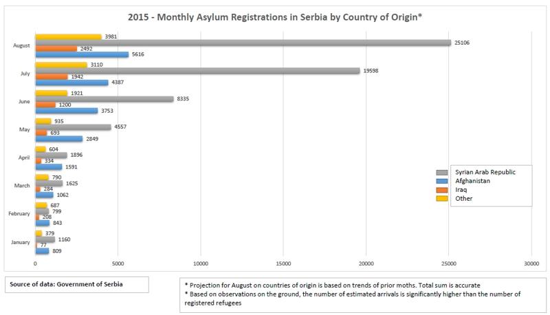 Srovnejte to s celkovým počtem uprchlíků v malých zemích jako Jordánsko (6 mil. obyvatel) a Libanon (4 mil.) proti celé EU-25 (500 mil.). Hned je jasné, kde je skutečná krize. Uprchlíci musí utíkat přes jim nepřátelské Turecko, které zbraněmi podporuje ISIL v Sýrii. Pak projdou s kojenci Turecko, a pokud z nich neudělají otroky v Albánii řízené mafiemi nebo je nezavraždí v Kosovu, pak se dostanou přes muslimský Balkán do první skutečně evropské země, tedy do Srbska. Tato země je jejich první zastávkou, kde žádají pomoc a kde lze pořídit první statistiky. Hlavní migrační cestu najdete na této mapě UNHCR. Ale Srbsko není v EU. Další cesta proto vede do Maďarska, které už na hranicích se Srbskem staví plot. Klíčový je tedy údaj o počtu a státní příslušnosti uprchlíků v Srbsku, kam se dostanou do táborů ošetřovaných mimo jiné i UNHCR. To jsou uprchlíci z Blízkého východu, kteří přeplavali, a proto mají šanci zaklepat na dveře sociálně-darwinistické a licoměrné EU.