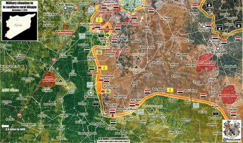 Začneme úspěchy teroristů, protože nějaké jsou. Nyní pochopili, že kde bojují Rusové, tam jde o život. To není US-estráda ročního bombardování prázdné pouště a předem označených budov ISIL, které pod ochranou US-instruktorů zdejší teroristé včas vyklidili. Vše ve jménu boje proti terorismu, pochopitelně. Pro úspěchy Al-Núsry (to jsou ti západní demokraté) se podívejte na weby povstalců, třeba zde, ale přehlednější mapy bereme od nezávislých. Všechny Západem podporované frakce jsou už zcela oficiálně buď v ISIL, nebo v al-Núsře. To je výsledek ruského bombardování a ofenzívy Asadových spojenců. Hned je situace přehlednější, předtím těch bojujících demokratů bylo po skupinkách příliš mnoho. Klíčové boje se odehrávají kolem Kuwejru, kde je SAA asi 2 km od základny obklíčené už 2 roky teroristy. Tam se také Al-Núsra a spol snaží přetnout jedinou zásobovací silnici SAA na Aleppo, kde se pomalu uzavírá obklíčení. Viz černé šipky relativně úspěšných protiofenzív povstalců na vybrané body.