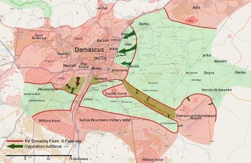 Jobar už málem nenajdete, a tam povstání v Damašku začalo ve druhé polovině 2012. Dnes je to jen zelená tečka dole vlevo na mapě. Nový Stalingrad dobývaný dům od domu se jmenuje "Východní Ghutta". Tam byly ony útoky sarinem, o nichž se nyní v korporátkách nemluví, viz naše články pod heslem "sarin". Dva opoziční turečtí poslanci chtějí nezávislým parlamentním šetřením zjistit, zda sarin nepřišel z Turecka. Pak by těch tisíc civilistů zavraždili samotní teroristé podporovaní Tureckem a NATO. Ale kdo by se dnes staral o detaily, když Putin bombarduje ty nemocnice v Sýrii...
