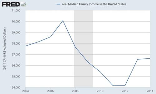 Klikatá křivka ukazuje průměrný příjem domácností, ale průměr hodně klame, viz úvod článku. I tak je vidět hluboký propad za Obamovy vlády. Poslední graf je zajímavý.
