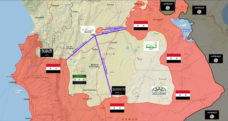 Nahoře je už turecká hranice a vzdálenost mezi styčnými body front je 6,5 km. Dalším důležitým místem jsou boje v Idlíbu, kde se postupně chystá obklíčení města ze tří stran. Stejně jako v případě jiných míst i toto místo je drženo povstalci či teroristy od roku 2012.