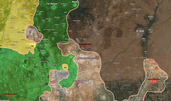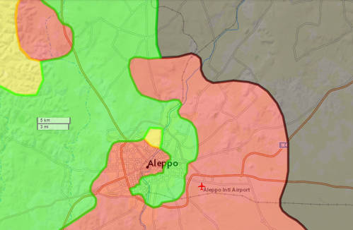Postup armády pomalu uzavírá první kotel směrem od dobyté základny Kweirim k Al-Báb. Druhý kotel vzniká přetnutím hlavní zásobovací trasy přímo v Aleppu. Druhý kotel vidíte lépe na této mapě, žlutá jsou Kurdové, kteří bojují s Asadem.