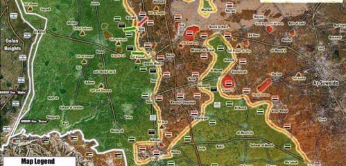 Vlevo vidíte Golany, což už je blízko. SAA navíc překvapivým útokem dobyla klíčovou část města Daráa a kontroluje hraniční přechod s Jordánskem, odkud jde hlavní pomoc teroristům.