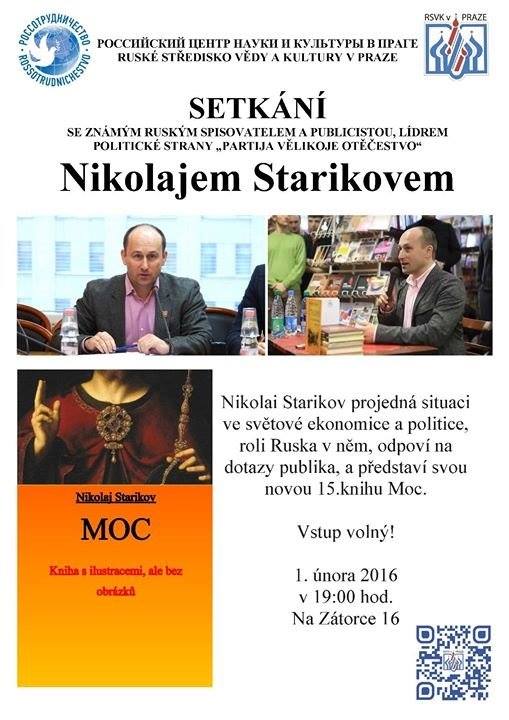 Jak jsem však uvedl, na tomto setkání nešlo o ideologii ani o koryta, ale o konkrétní akce a vzájemnou informovanost. Výsledkem tedy bude něco jako kalendář aktivistických akcí v roce 2016, o němž budeme i na e-Republice průběžně informovat. Pro začátek jsem si všiml jedné ohlášené akce celostátního, vlastně spíše mezinárodního významu. Jde o setkání se spisovatelem, historikem a politikem Nikolajem Starikovem, které se uskuteční dne 1. 2. 2016 od 19.00 hod .v Ruském středisku vědy a kultury v Praze, Na Zátorce 16.