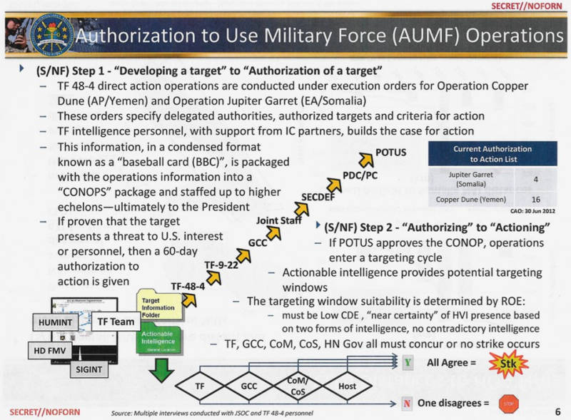 Putin zabíjel, tedy pravděpodobně. Ale Obama zabíjí a zabíjel, a to zcela určitě. Web zveřejnil celou sérii brilantních odhalení nazvanou The Drone Papers o programu cílených mimosoudních poprav občanů celého světa, které podepisuje Obama jako americký prezident. Klíčová část dokumentů se jmenuje Vraždící kolečko (Kill Chain) a popisuje celý postup schvalování státní vraždy. Celý řetěz rozhodnutí vypadá podle dokumentů Interceptu následovně.