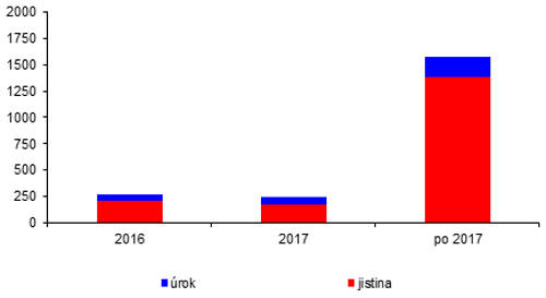 Vývoj dluhové služby ze střednědobých a dlouhodobých závazků podle stavu k 31. 12. 2015 (v mld. Kč)
