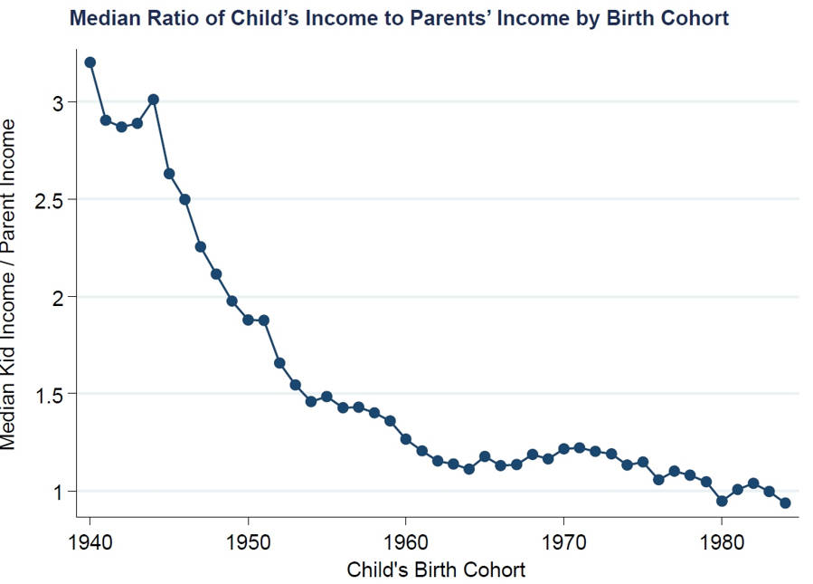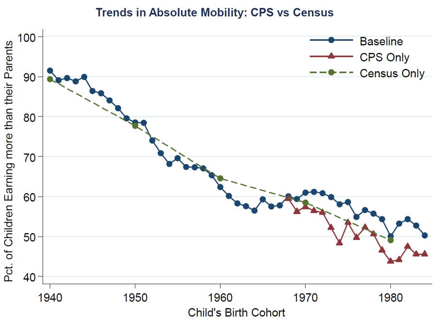 A nyní k věci, tedy ke zhroucení jiného zakládajícího mýtu tentokrát US-provenience. Harvardští ekonomové publikovali studii pod názvem The Fading American Dream: Trends in Absolute Income Mobility Since 1940. Celou si ji můžete stáhnout kliknutím na odkaz. Ale pro nás jsou mnohem důležitější vysvětlující grafy, které si můžete stáhnout kliknutím zde. Citovaná skupina vědců zkoumala od roku 1940 až do dneška jev zvaný absolute income mobility. Je to úplně jednoduchá věc, jak se na kapitalismus sluší a patří. Prostě generaci za generací zjišťujete, kolik procent dětí z následující generace vydělává více, než jejich rodiče. Protože v kapitalismu se máme všichni lépe a jedno promile dokonce i nejlépe, tak se na ta čísla podíváme.