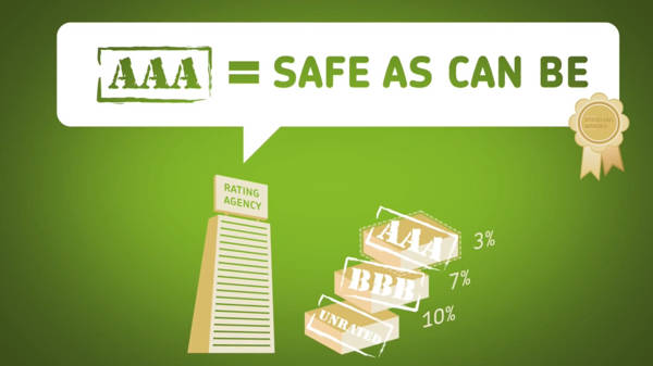 A protože Vlci-Banksteři byli nenažraní přímo bankstersky, tak začali prodávat hloupým dospělákům tyto krabičky za docela vysokou cenu. Který hlupák si tuto začarovanou krabičku koupil, ten na ni začal vydělávat podle příslušného úroku. Vy se milé děti můžete ptát, proč ti hloupí dospělí ty krabičky kupovali za veliké peníze, když nevěděli, co v nich doopravdy je. I na to Vlci-Banksteři mysleli a řekli svým kamarádům, aby na krabičky dali takové růžové mašličky, aby to celé hezky vypadalo. Tito Lži-vlci se jmenují Ratingové agentury a dávají razítka na cokoliv, takže orazítkovali i ty prázdné krabičky. Prázdné krabičky dostaly mašličky a razítka a celé to vypadalo takto hezky.