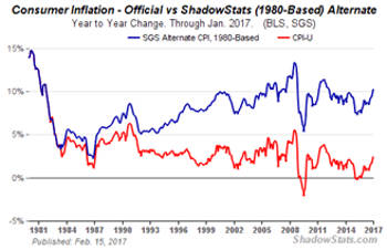 Pokud vezmeme za základ přepočtu inflace hladinu cen z 80. let, pak je to dokonce 10 %. A to je pětkrát více, než uvádí oficiální statistika. Zajímavé jsou i údaje o nezaměstnanosti. Vláda USA oficiálně udává v lednu 2017 celkem 6 % a jeho Shadow Stats dokonce 22,9 %, viz data zde.
