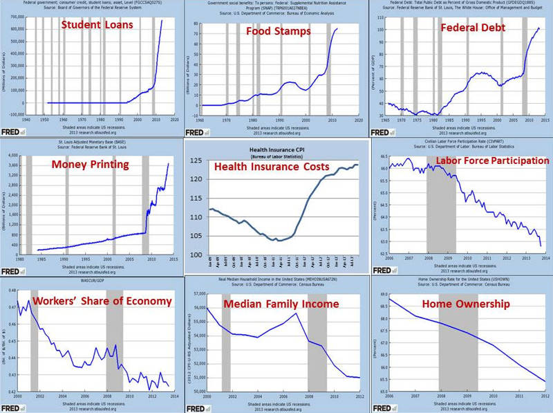 Statistiky se týkají všech klíčových ukazatelů ekonomiky: dluhu ze studentských půjček, federálního dluhu USA,růstu žebračenek na jídlo pro nejchudší, tisku inflačních dolarů, nákladů na zdravotnictví, podílu americké pracovní síly ve zdejší ekonomice, podílu pracujících na vytvořeném zisku, průměrného rodinného příjmu domácností a počtu majitelů vlastních domů. Obama tedy jasně ožebračil Ameriku. To ukazuje i nulový růst platů a mezd, což přesně odpovídá české korporátní cestě za kapitalismem s americkou tváří, protože korporátní USA je náš už dávno překonaný vzor.