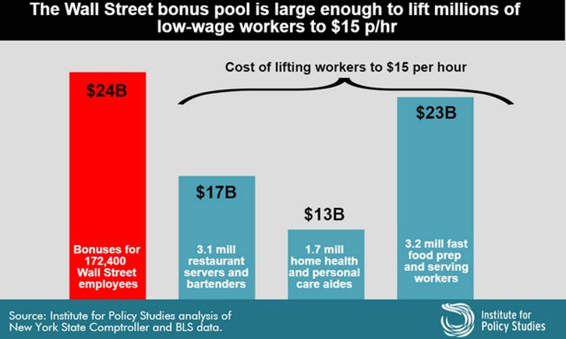 Banky na Wall Street rozdaly celkem 23.9 miliard dolarů jako odměny (!) svým 177 tis. zaměstnancům v New Yorku, kteří zde musí hlásit své příjmy ke zdanění. Tato suma celkem 1,6x převyšuje mzdu vyplácenou na plný pracovní úvazek celkem 1,075,000 Američanů, kteří dostávají žebráckou minimální mzdu 7.25 dolarů za hodinu. Takže Obamovi je za co tleskat a chudáci mají být tomu sociálně smýšlejícímu prezidentovi za co vděční. Následující graf ukazuje, co by se stalo, kdyby se Obama opravdu choval jako demokratický prezident a ne jako lobbista Wall Streetu, což byl jeho full-time džob. Znovu pracujeme s bonusy Wall Streetu deklarovanými těmi, kdo bydlí v New Yorku a jen tam.