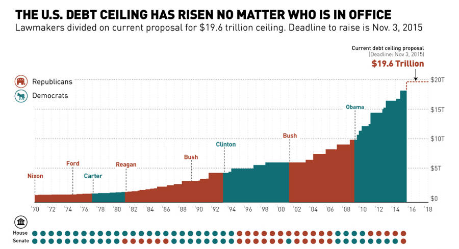 Současný oficiální dluh za Trumpa (cca 20 biliónů a 103 % HDP země) dostal USA na úroveň států, jako je zbankrotované Řecko. Takže banksteři shromáždění okolo jimi kontrolovaného privátního FEDu dostali do rukou tzv. "fiat money", čili klasické bankovní úvěry. Mohli je rozdat lidem stejně zadarmo, jako je dostali sami, tedy za úrokovou míru pod jedno procento. Nebo s těmito dluhovými penězi mohli zničit stát. Připomeňme, že stát si povinně musí půjčovat u bank a nesmí si sám tisknout nekryté peníze. V rámci EU to přikazuje článek 123 Lisabonské smlouvy schválený v prosinci 2007. A oficiální federální dluh je směšný, protože skutečný dluh USA se všemi finančními závazky je ve skutečnosti 70 biliónů. Viz tato studie institutu Cato z roku 2013 (PDF a žlutě zatrženo na str. 40). Neoliberální think-tank Cato slouží do roztrhání těla nikoli jednomu procentu, ale pouze jednomu promile. Potřebuje vidět dluhy státu reálně, protože je třeba ožebračit chudé, kteří berou peníze jednomu procentu tím, že z daní střední třídy dostávají dávky a jinou pomoc. Až se chudí a střední třída ožebračí úplně, pak se mohou snížit již tak směšné daně jednomu procentu a hlavně jednomu promile, kterému tento institut slouží. Jak vypadá vláda banskterů nad ožebračenou zemí typu Řecka nebo USA, to ukazuje tento graf s kompletním 70biliónovým dluhem.